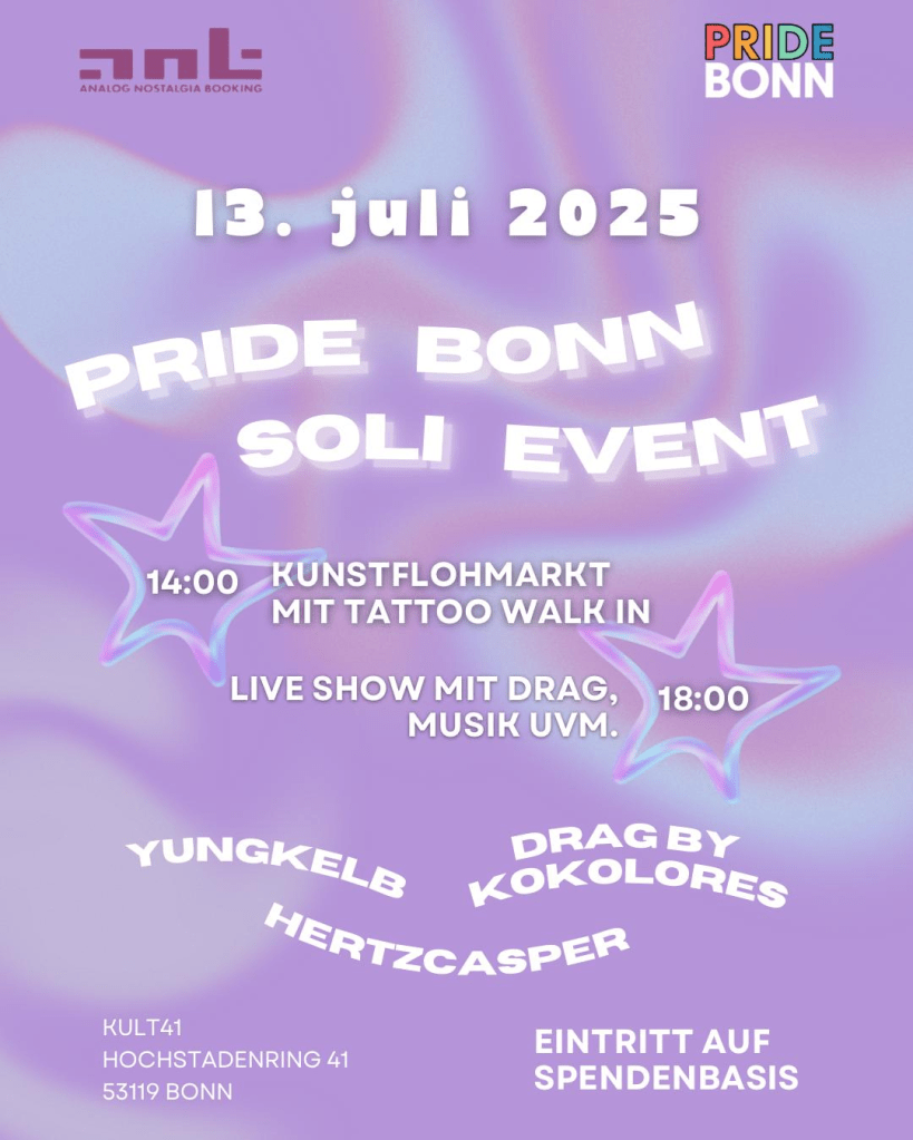 Ab 18 Uhr startet das Live Programm mit Poetry, Drag und Live Musik. Der Drag Teil des Programms wird von der Bonner Drag Stage Kokolores beigetragen. Als musikalische Acts sind der Rapper YungKelb und die genreübergreifende Band Hertzcasper dabei.